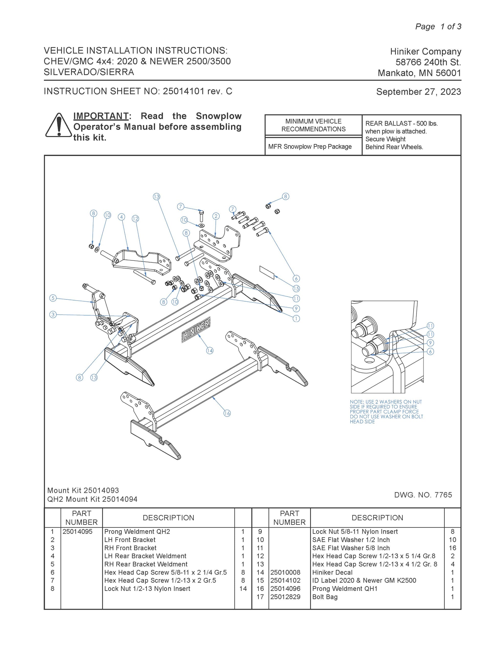 Hiniker Snowplow Mount - Quick Hitch 2 (QH2), 2020 & Newer GM/ Chevy K2500-3500, 25014992