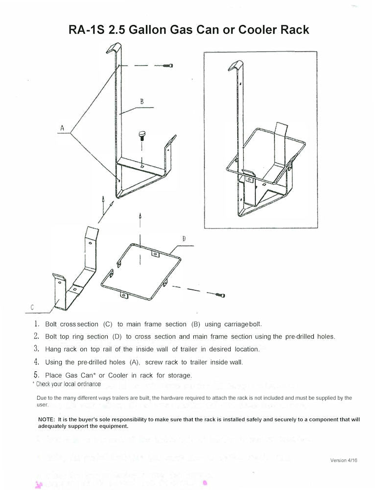 Holds one round steel can or one rectangular plastic can / cooler in enclosed trailers